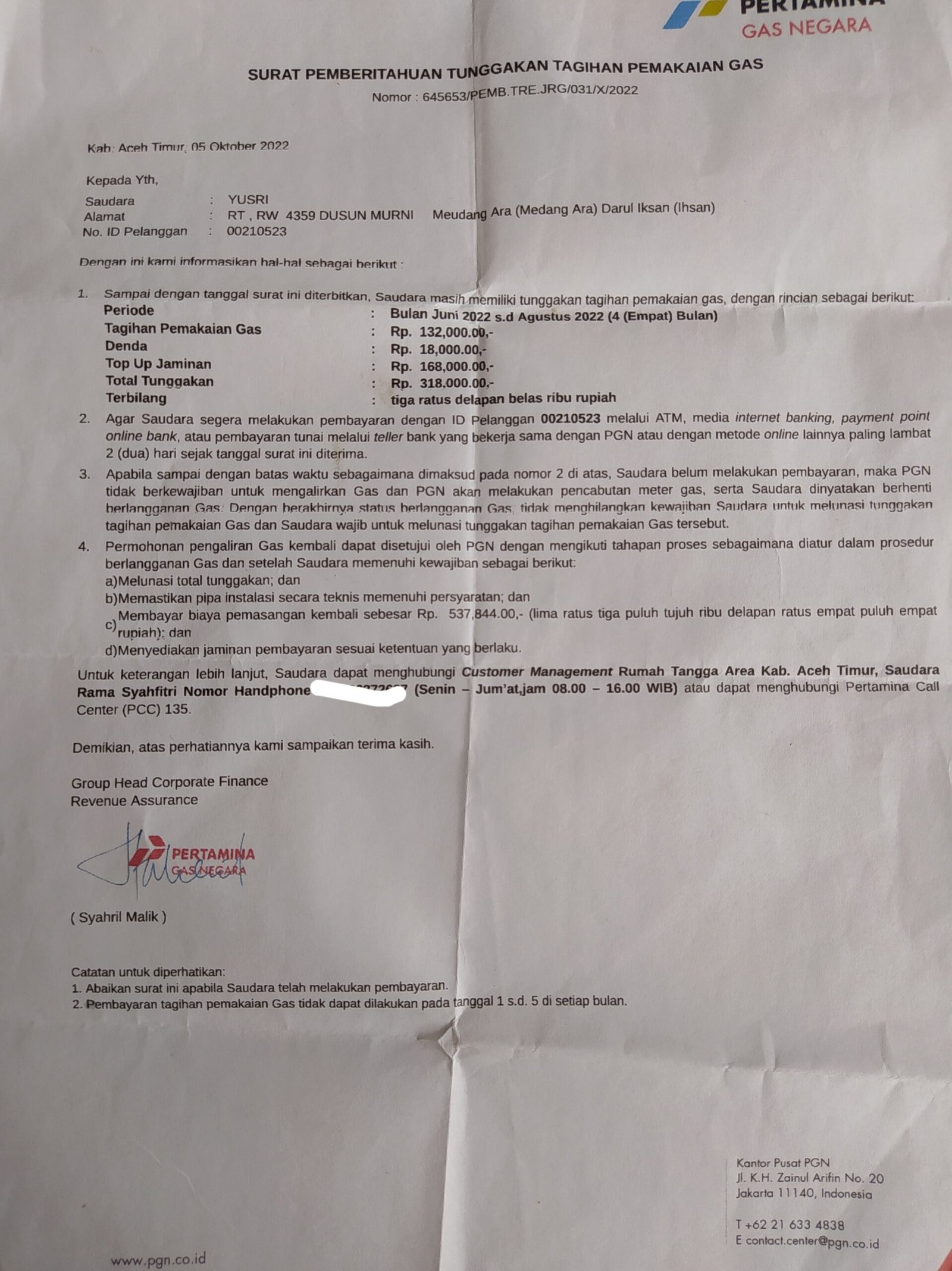 Setelah melihat isi surat tersebut dengan berisikan tagihan penggunaan gas dengan rincian periode bulan Juni 2022 sampai dengan Agustus 2022 selama empat bulan, adapun rincian dengan total tagihan pemakaian gas Rp 132.000.00.