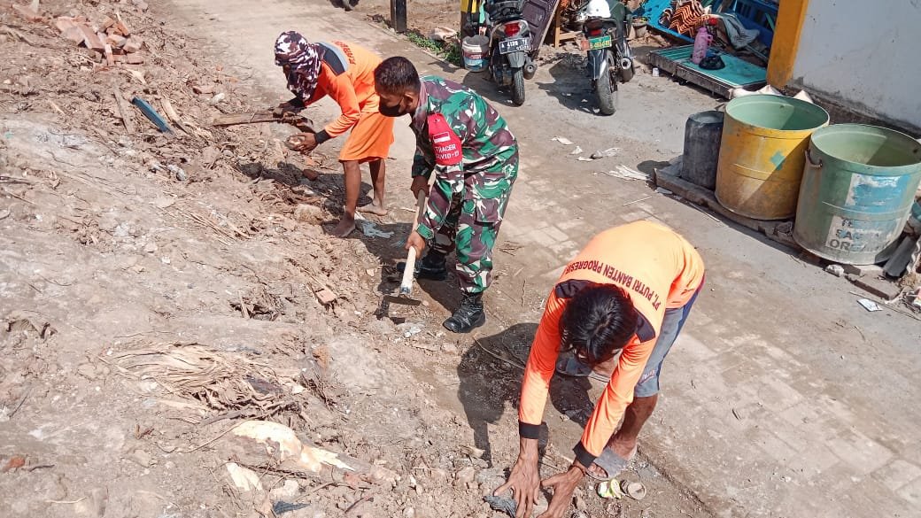 CILEGON,- Matamedia.co.id,- Anggota Koramil 2301/Cilegon Kodim 0623/Cilegon giat Karya Bakti (Karbak) perataan jalan kampung dan pembangunan tempat ibadah di wilayah Kelurahan Bendungan Kecamatan Cilegon dan Kelurahan Jombang Wetan Kecamatan Jombang Kota Cilegon Banten, Jum’at (17/06/2022)