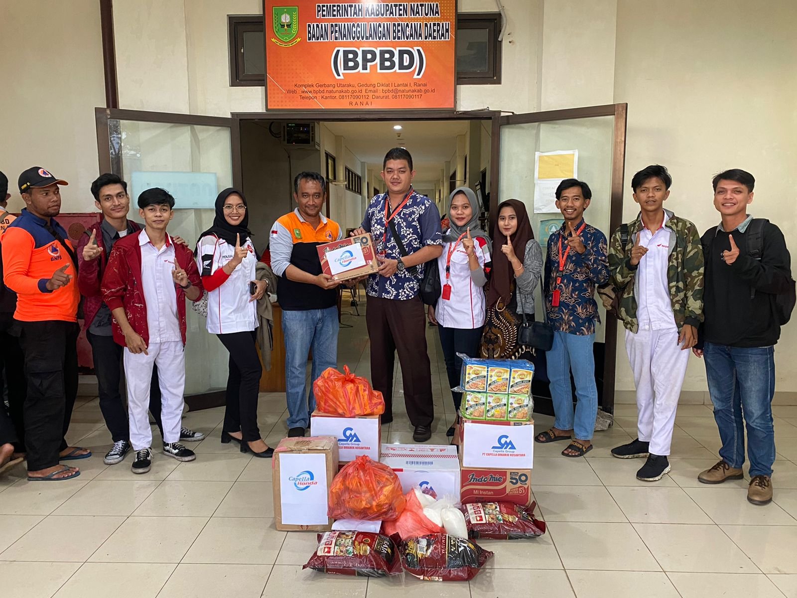 Penyerahan paket sembako yang terdiri dari Beras, Indomie, Gula, Teh dan Biskuit di berikan pada Jumat (16/12) yang secara langsung di serahkan oleh Bp Heru selaku Pimpinan Dealer Honda Natuna kepada Bp Achmad Zainuri, S.IP perwakilan Badan Penanggulangan Bencana Daerah Natuna.