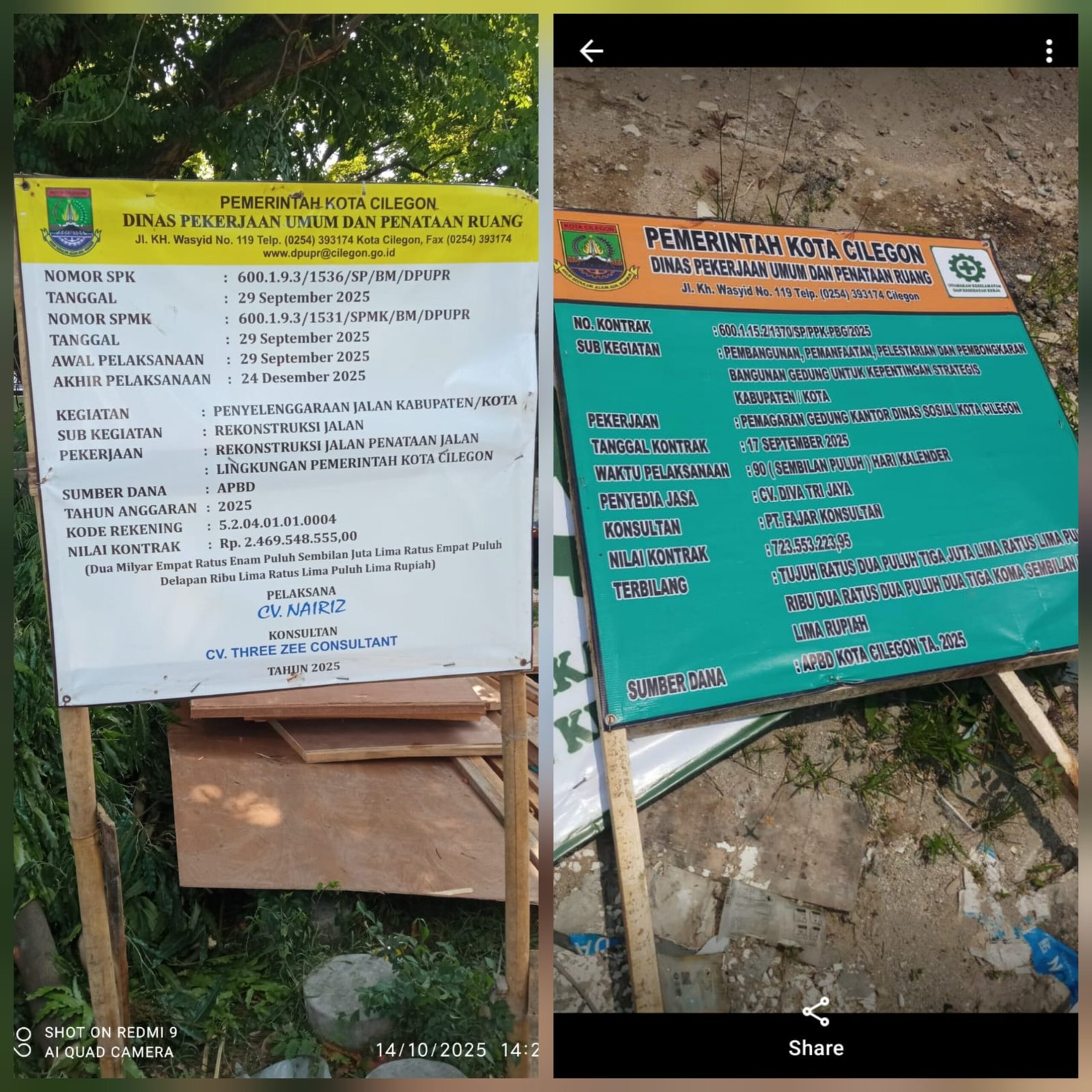 “kita sudah menghitung dan mengestimasi serta mendokumentasikan foto dan video kedua pekerjaan tersebut yaitu Pemageran gedung dinsos di kegiatan dari dinas PUPR kota Cilegon bagian cipta karya (CK)serta pekerjaan Rekontruksi jalan dan penataan jalan yang di kerjakan oleh CV.NAIRIZ pekerjaan di bidang Bina marga (BM),” ungkap Romi.