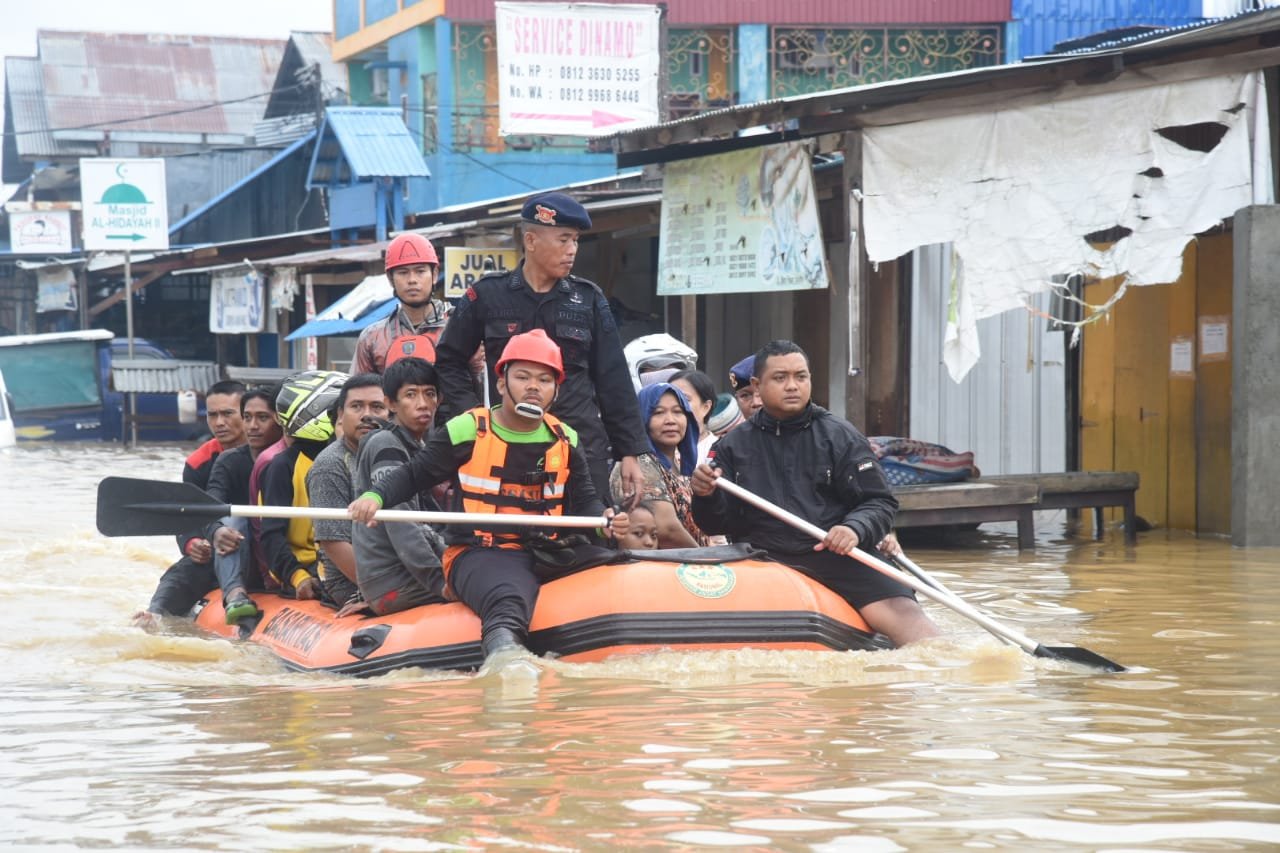 Selain mengevakuasi warga yang terendam banjir, personel juga memberikan bantuan makanan siap saji kepada warga, dengan menggunakan 1 Unit perahu karet personel Dit Polairud menyisir setiap warga yang masih bertahan di rumah masing-masing.